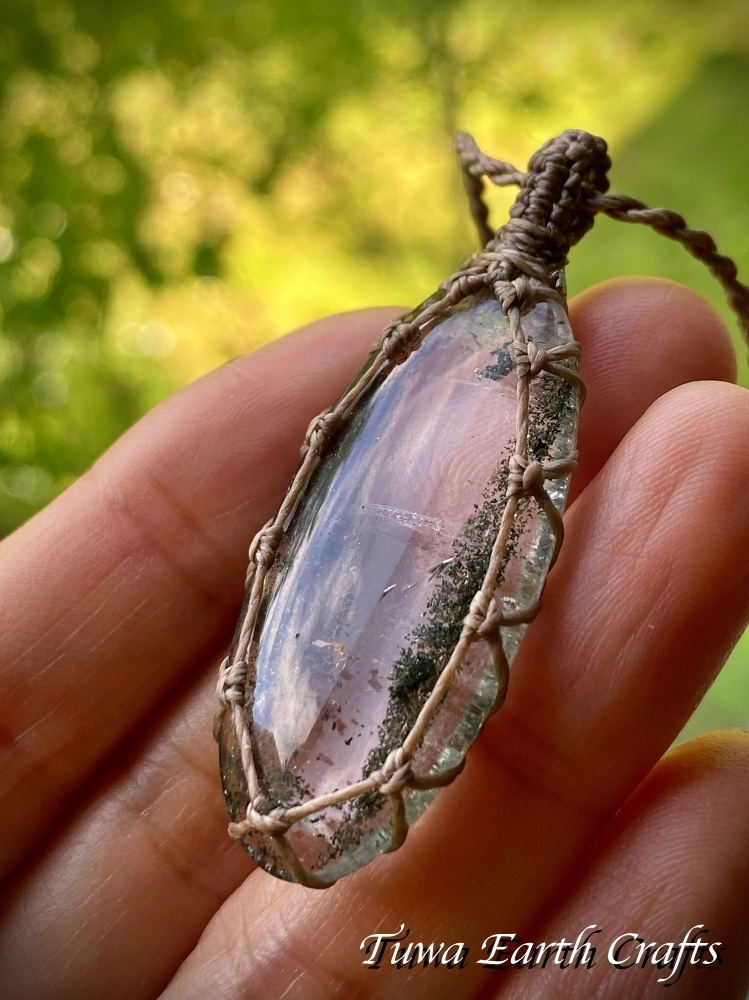 石全長4cm大ぶり♪【開運・自営業お守り・財運アップ】高品質ガーデンクォーツ ペンダント/ネックレス*シンプル 庭園水晶 クローライトインクォーツ 1点もの*天然石パワーストーン アクセサリー マクラメ お守りヒーリングジュエリー スピリチュアル [TUWA-1800]