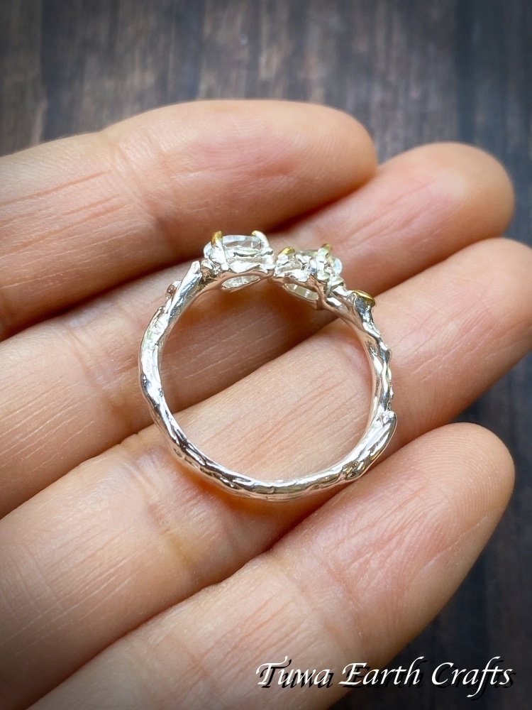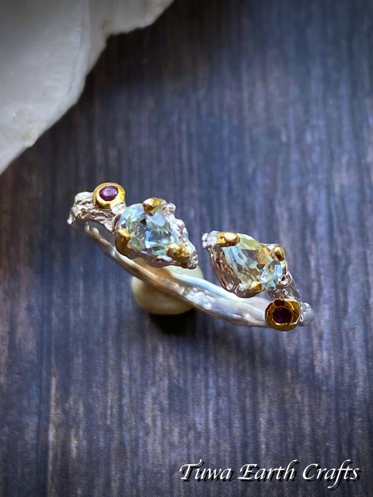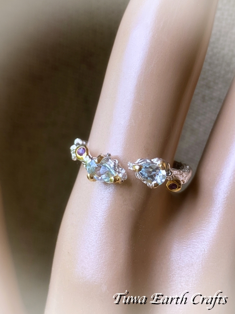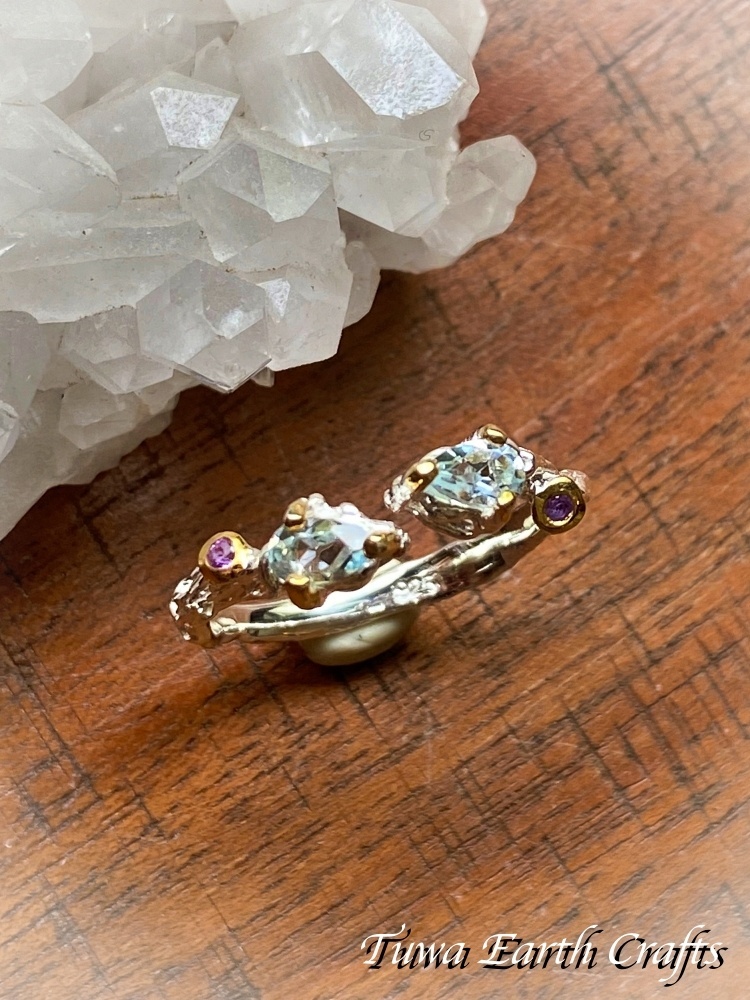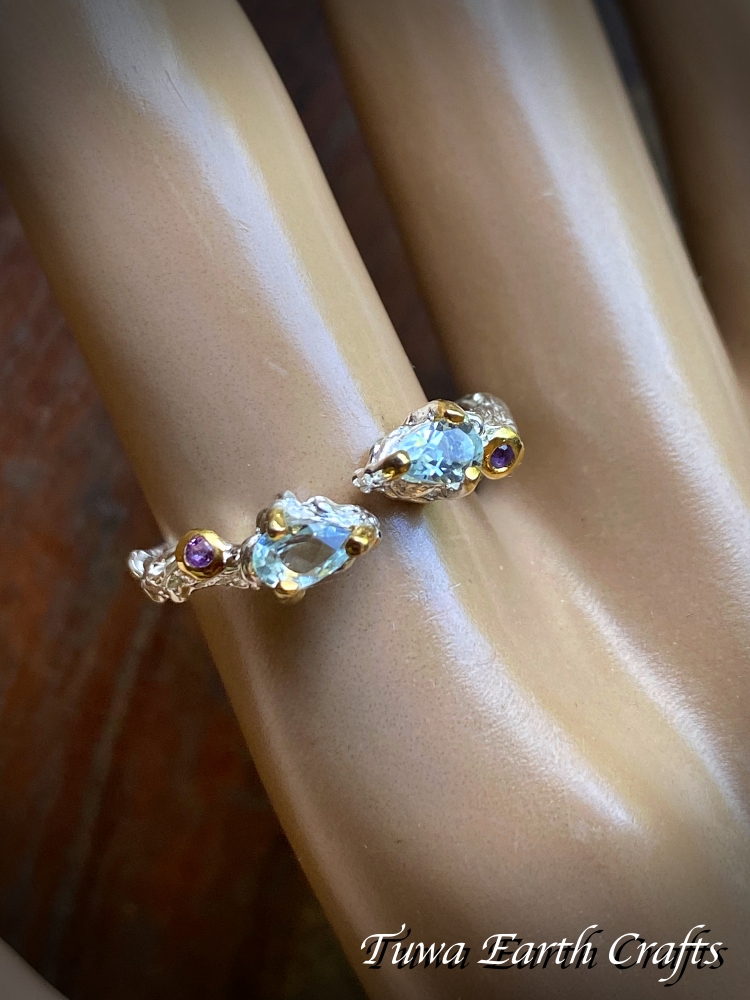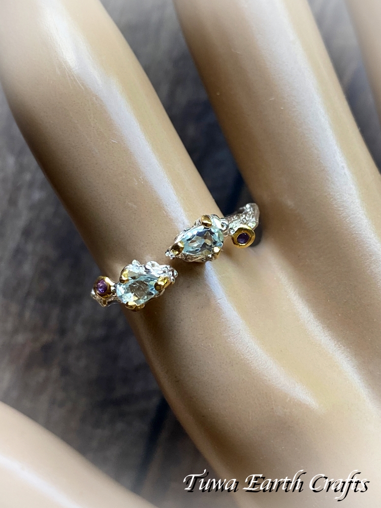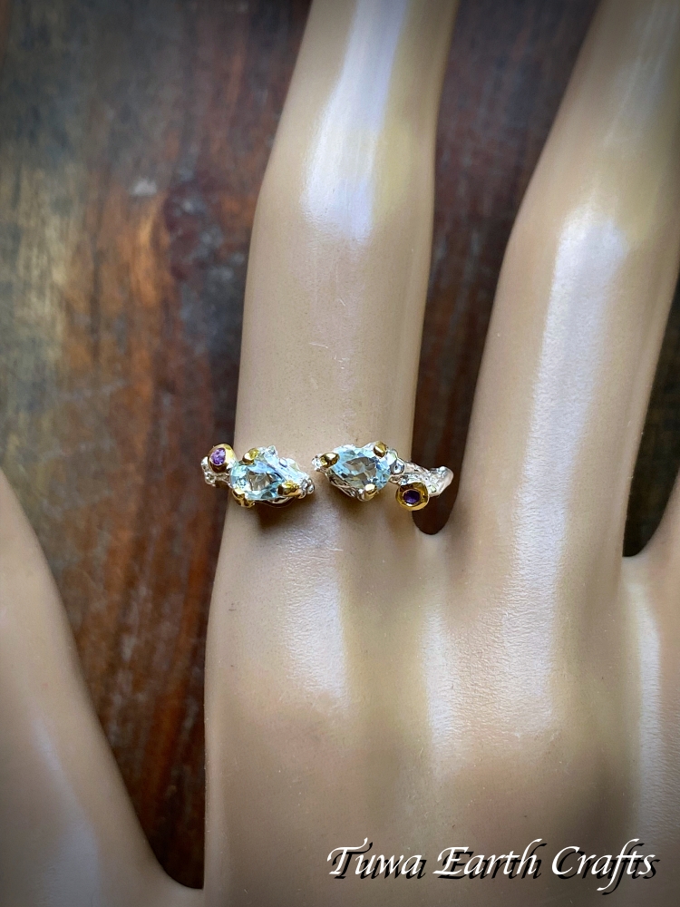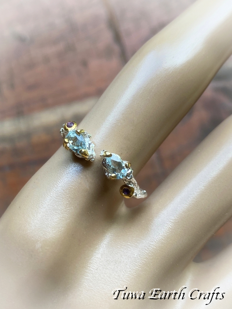 【チャンスの引き寄せ・直観力アップ】宝石質ブルートパーズ 指輪リング with アメジスト サイズ調節可能 16号 17号 18号 天然石アクセサリー キレイめ 上品 デザイン 1点もの ハンドメイド 彫金ジュエリー 銀細工 [ST5408]